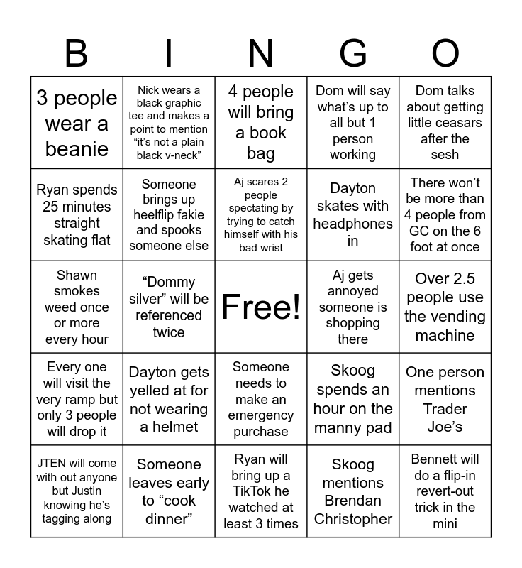 This bingo card has a free space and 24 words: Dayton gets yelled at for not wearing a helmet, Someone leaves early to “cook dinner”, Aj scares 2 people spectating by trying to catch himself with his bad wrist, JTEN will come with out anyone but Justin knowing he’s tagging along, Dom talks about getting little ceasars after the sesh, 3 people wear a beanie, Ryan spends 25 minutes straight skating flat, Nick wears a black graphic tee and makes a point to mention “it’s not a plain black v-neck”, Aj gets annoyed someone is shopping there, Someone needs to make an emergency purchase, Dayton skates with headphones in, Shawn smokes weed once or more every hour, Skoog spends an hour on the manny pad, One person mentions Trader Joe’s, Someone brings up heelflip fakie and spooks someone else, Skoog mentions Brendan Christopher, Over 2.5 people use the vending machine, 4 people will bring a book bag, There won’t be more than 4 people from GC on the 6 foot at once, “Dommy silver” will be referenced twice, Bennett will do a flip-in revert-out trick in the mini, Every one will visit the very ramp but only 3 people will drop it, Dom will say what’s up to all but 1 person working and Ryan will bring up a TikTok he watched at least 3 times.