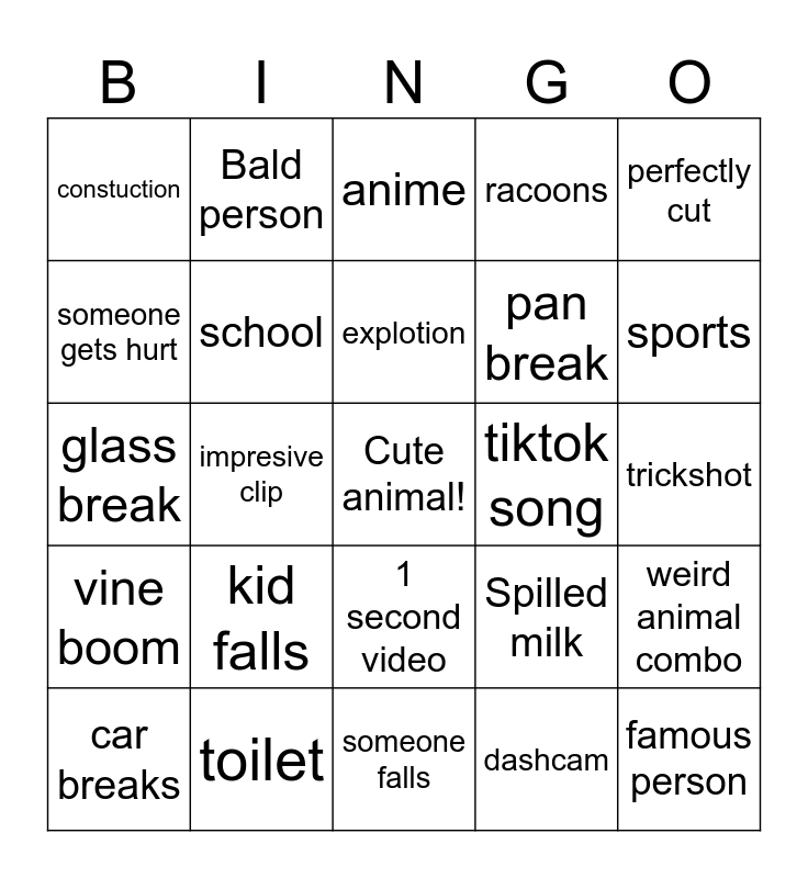 This bingo card has a free space and 27 words: Spilled milk, Text on screen, pan break, someone falls, someone gets hurt, anime, Bald person, vine boom, tiktok song, weird animal combo, glass break, racoons, car breaks, toilet, sports, loud=funny, school, explotion, kid falls, constuction, trickshot, dashcam, impresive clip, famous person, 1 second video, perfectly cut and flinch.