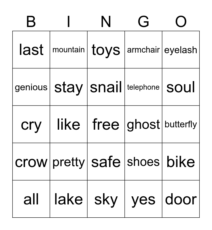 This bingo card has a free space and 29 words: all, short, like, gorgeous, last, toys, stay, pretty, ghost, lake, butterfly, door, sky, yes, soul, really, safe, crow, eyelash, cry, shoes, hand, telephone, genious, armchair, mountain, bike, snail and orange.