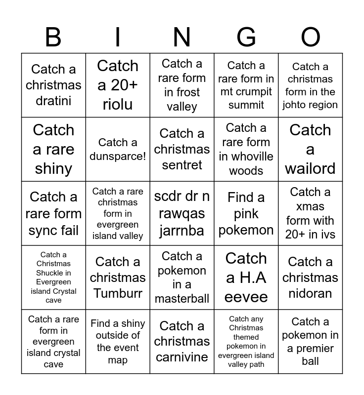 This bingo card has a free space and 24 words: Catch a christmas Tumburr, Find a shiny outside of the event map, Catch a christmas sentret, Catch a rare form in evergreen island crystal cave, Catch a christmas form in the johto region, Catch a christmas dratini, Catch a rare shiny, Catch a 20+ riolu, Find a pink pokemon, Catch a pokemon in a masterball, Catch a rare form in whoville woods, Catch a rare form sync fail, Catch a H.A eevee, Catch a christmas nidoran, Catch a dunsparce!, Catch any Christmas themed pokemon in evergreen island valley path, Catch a xmas form with 20+ in ivs, Catch a rare form in frost valley, Catch a wailord, Catch a rare christmas form in evergreen island valley, Catch a pokemon in a premier ball, Catch a Christmas Shuckle in Evergreen island Crystal cave, Catch a rare form in mt crumpit summit and Catch a christmas carnivine.
