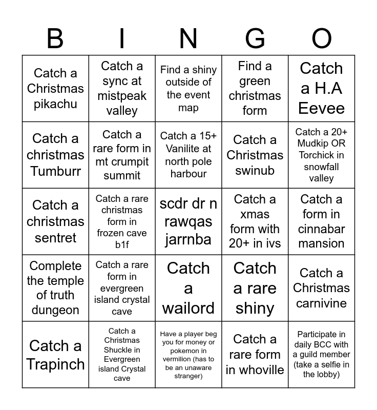 This bingo card has a free space and 24 words: Catch a rare form in evergreen island crystal cave, Catch a Christmas Shuckle in Evergreen island Crystal cave, Catch a 15+ Vanilite at north pole harbour, Catch a Trapinch, Catch a H.A Eevee, Catch a Christmas pikachu, Catch a christmas Tumburr, Catch a sync at mistpeak valley, Catch a xmas form with 20+ in ivs, Catch a wailord, Catch a Christmas swinub, Catch a christmas sentret, Catch a rare shiny, Catch a Christmas carnivine, Catch a rare form in mt crumpit summit, Catch a rare form in whoville, Catch a form in cinnabar mansion, Find a shiny outside of the event map, Catch a 20+ Mudkip OR Torchick in snowfall valley, Catch a rare christmas form in frozen cave b1f, Participate in daily BCC with a guild member (take a selfie in the lobby), Complete the temple of truth dungeon, Find a green christmas form and Have a player beg you for money or pokemon in vermilion (has to be an unaware stranger).