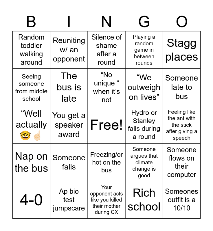 This bingo card has a free space and 24 words: Someone falls, Ap bio test jumpscare, “No unique “ when it’s not, 4-0, Stagg places, Random toddler walking around, Seeing someone from middle school, Reuniting w/ an opponent, Hydro or Stanley falls during a round, Freezing/or hot on the bus, “We outweigh on lives”, “Well actually 🤓☝🏻, Someone argues that climate change is good, Someone flows on their computer, The bus is late, Rich school, Feeling like the ant with the stick after giving a speech, Silence of shame after a round, Someone late to bus, You get a speaker award, Someones outfit is a 10/10, Nap on the bus, Playing a random game in between rounds and Your opponent acts like you killed their mother during CX.
