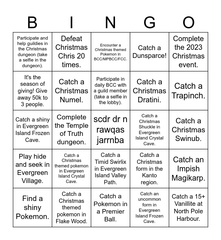 This bingo card has a free space and 24 words: Catch a Christmas themed pokemon in Evergreen Island Crystal Cave., Catch a Christmas themed pokemon in Flake Wood., Participate in daily BCC with a guild member (take a selfie in the lobby)., Find a shiny Pokemon., Complete the 2023 Christmas event., Participate and help guildies in the Christmas dungeon (take a selfie in the dungeon)., It's the season of giving! Give away 50k to 3 people., Defeat Christmas Chris 20 times., Catch a Christmas Shuckle in Evergreen Island Crystal Cave., Catch a Timid Swirlix in Evergreen Island Valley Path., Catch a Christmas Dratini., Catch a shiny in Evergreen Island Frozen Cave., Catch a Christmas form in the Kanto region., Catch an Impish Magikarp., Catch a Christmas Numel., Catch an uncommon form in Evergreen Island Frozen Cave., Catch a Christmas Swinub., Encounter a Christmas themed Pokemon in BCC/MPBCC/FCC., Catch a Trapinch., Complete the Temple of Truth dungeon., Catch a 15+ Vanillite at North Pole Harbour., Play hide and seek in Evergreen Village., Catch a Dunsparce! and Catch a Pokemon in a Premier Ball..