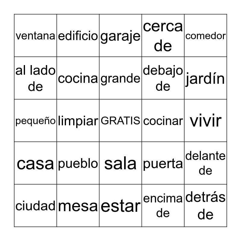 This bingo card has a free space and 33 words: afueras, algo, limpiar, campo, casa, cocina, comedor, ciudad, edificio, escritorio, grande, garaje, granja, habitación, cocinar, jardín, mesa, pequeño, pueblo, puerta, sala, silla, ventana, vivir, estar, detrás de, cerca de, debajo de, al lado de, delante de, lejos de, encima de and adentro de.