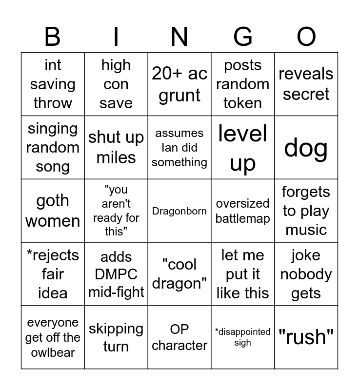 This bingo card has a free space and 31 words: OP character, 9+ level spell mention, "you aren't ready for this", psychic damage, int saving throw, 20+ ac grunt, shut up miles, let me put it like this, oversized battlemap, *disappointed sigh, forgets to play music, "rush", reference to x media, complicated weapon, dog, too quiet, joke nobody gets, adds DMPC mid-fight, *rejects fair idea, "cool dragon", reveals secret, new airships, everyone get off the owlbear, high con save, level up, singing random song, posts random token, goth women, skipping turn, assumes Ian did something and "bash your head in".