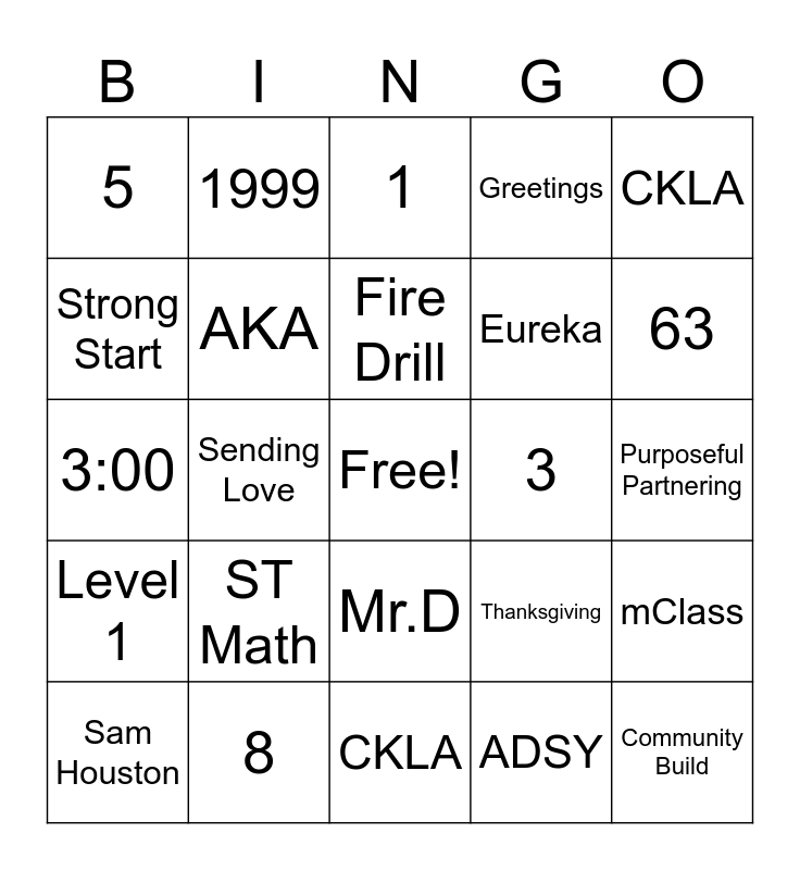 This bingo card has a free space and 38 words: Texans, Cowboys, SGRho, AKA, mClass, ST Math, Fire Drill, Greetings, CKLA, Eureka, Sending Love, Greetings, Community Build, Purposeful Partnering, Strong Start, Level 1, Level 2, 1, 2, 3, 5, 8, 63, Sam Houston, Greetings, CKLA, Eureka, Earl and Hazel, Coleman, Hill, Horace, Mr.D, ADSY, 1999, Mondays, Thanksgiving, 3:00 and 7:25.