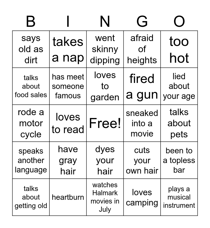 This bingo card has a free space and 24 words: have gray hair, heartburn, loves to garden, talks about getting old, too hot, says old as dirt, talks about food sales, takes a nap, sneaked into a movie, dyes your hair, fired a gun, rode a motor cycle, cuts your own hair, been to a topless bar, has meet someone famous, loves camping, talks about pets, went skinny dipping, lied about your age, loves to read, plays a musical instrument, speaks another language, afraid of heights and watches Halmark movies in July.
