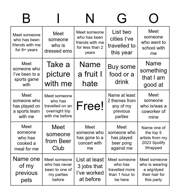 This bingo card has a free space and 30 words: Meet someone who has never been to one of my parties before, Swap stories with someone about how you met me, Meet someone who has travelled on an overnight trip with me before, Meet someone who is dressed as the same era of Karen as you, Meet someone who has been friends with me for 8+ years, Meet someone who has been friends with me for less than 2 years, Take a picture with me, Meet someone who has gone to a concert with me, Name at least 2 themes from any of my previous parties, List at least 3 jobs that I’ve worked at before, Meet someone who is/was a coworker of mine, Meet someone who is wearing a wig/dyed their hair for this party, Meet someone who has travelled more than 1 hour to be here, Ask someone to tell you a fun fact about me, Name something that I am good at, Sing some karaoke, Meet someone who has played beer pong against me, Meet someone who has cooked a meal for me, Meet someone from Beer Club, Meet someone who went to school with me, Meet someone who has played on a sports team with me, Meet someone wearing pastel colours, Meet someone who is dressed emo, Buy some food or a drink, Meet someone who I’ve been to a sports game with, List two cities I’ve travelled to this year, Name one of the top 5 artists from my 2023 Spotify Wrapped, Name one of my previous pets, Name a fruit I hate and List one of my tattoos.