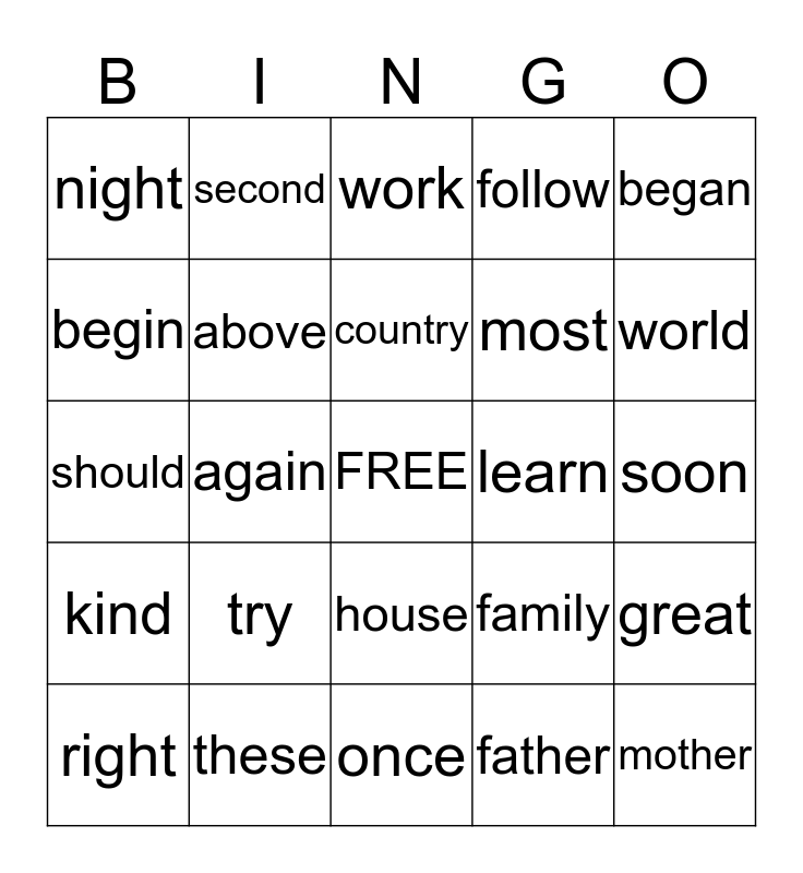 This bingo card has a free space and 36 words: near, high, even, above, family, kind, country, together, began, along, again, follow, until, learn, world, night, want, try, mother, work, soon, great, these, right, once, second, should, idea, most, begin, year, young, father, house, boy and earth.