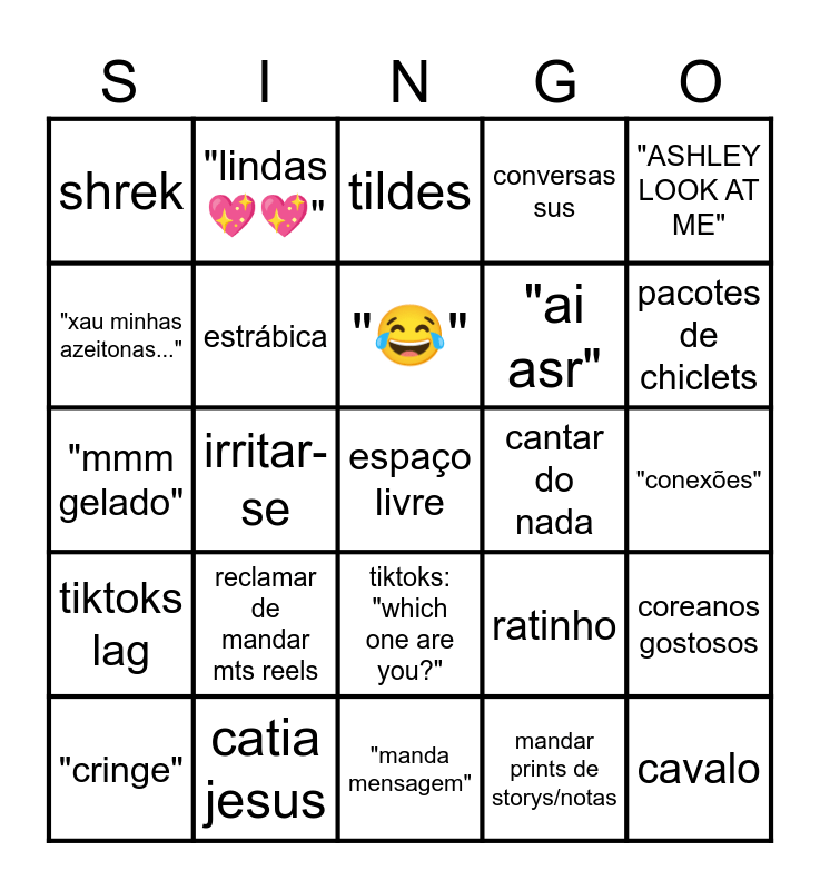 This bingo card has a free space and 31 words: "manda mensagem", lag, irritar-se, "cala-te" a objetos, shrek, tildes, estrábica, ratinho, cantar do nada, mandar prints de storys/notas, "conexões", cavalo, "🔞", compra aleatória, pacotes de chiclets, flex, coreanos gostosos, reclamar de mandar mts reels, tiktoks lag, tiktoks: "which one are you?", "ASHLEY LOOK AT ME", "UMA NUM MILHAO 👹VAI👹", "cringe", "lindas💖💖", "ai asr", "xau minhas azeitonas...", conversas sus, "mmm gelado", catia jesus, "😂" and "🤰".