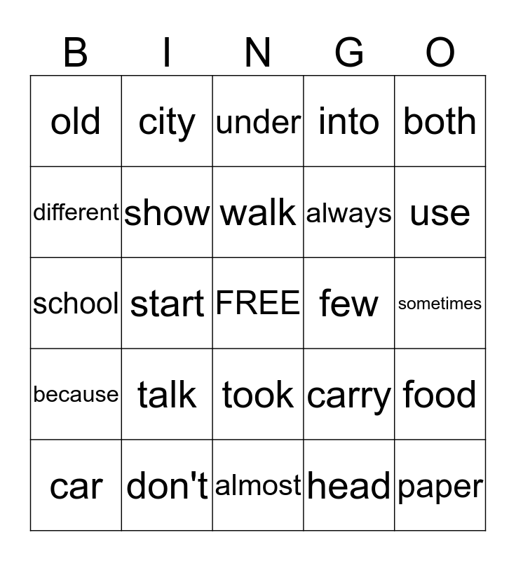 This bingo card has a free space and 36 words: first, could, about, show, carry, because, walk, long, both, two, start, into, story, few, use, old, more, talk, paper, under, sometimes, food, don't, car, almost, city, school, study, always, different, enough, large, head, took, though and people.