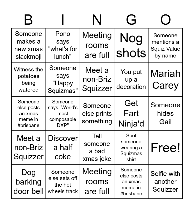 This bingo card has 51 words: Mariah Carey, Someone else prints something, Dog barking door bell, Meeting rooms are full, Discover a half coke, Someone gets noodled, Pono says "what's for lunch", Someone throws the blue plane, Witness the potatoes being watered, Someone else sets off the hot wheels track, Someone says "Happy Squizmas", Nog shots, Free!, Spot someone wearing a Squizmas shirt, Jingle Bell Rock, Someone hides Gail, Meet a non-Briz Squizzer, Get Fart Ninja'd, Alison takes her shoes off, Someone mentions a Squiz Value by name, Someone says "World's most composable DXP", Someone else posts an xmas meme in #brisbane, Someone makes a new xmas slackmoji, You put up a decoration, Tell someone a bad xmas joke, Selfie with another Squizzer, Mariah Carey, Someone else prints something, Dog barking door bell, Meeting rooms are full, Discover a half coke, Someone gets noodled, Pono says "what's for lunch", Someone throws the blue plane, Witness the potatoes being watered, Someone else sets off the hot wheels track, Someone says "Happy Squizmas", Nog shots, Spot someone wearing a Squizmas shirt, Jingle Bell Rock, Someone hides Gail, Meet a non-Briz Squizzer, Get Fart Ninja'd, Alison takes her shoes off, Someone mentions a Squiz Value by name, Someone says "World's most composable DXP", Someone else posts an xmas meme in #brisbane, Someone makes a new xmas slackmoji, You put up a decoration, Tell someone a bad xmas joke and Selfie with another Squizzer.