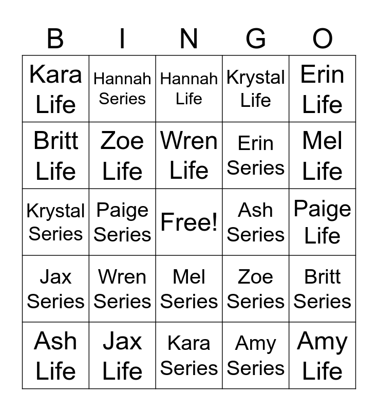 This bingo card has a free space and 24 words: Wren Series, Jax Life, Wren Life, Ash Life, Erin Life, Kara Life, Britt Life, Hannah Series, Ash Series, Mel Series, Erin Series, Krystal Series, Zoe Series, Britt Series, Zoe Life, Amy Series, Paige Life, Hannah Life, Mel Life, Paige Series, Amy Life, Jax Series, Krystal Life and Kara Series.