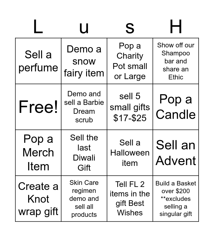 This bingo card has 16 words: Skin Care regimen demo and sell all products, Sell an Advent, Pop a Charity Pot small or Large, Sell a perfume, Pop a Merch Item, Demo a snow fairy item, Sell a Halloween item, Tell FL 2 items in the gift Best Wishes, Free!, Demo and sell a Barbie Dream scrub, Create a Knot wrap gift, Show off our Shampoo bar and share an Ethic, Sell the last Diwali Gift, Pop a Candle, sell 5 small gifts $17-$25 and Build a Basket over $200 **excludes selling a singular gift.