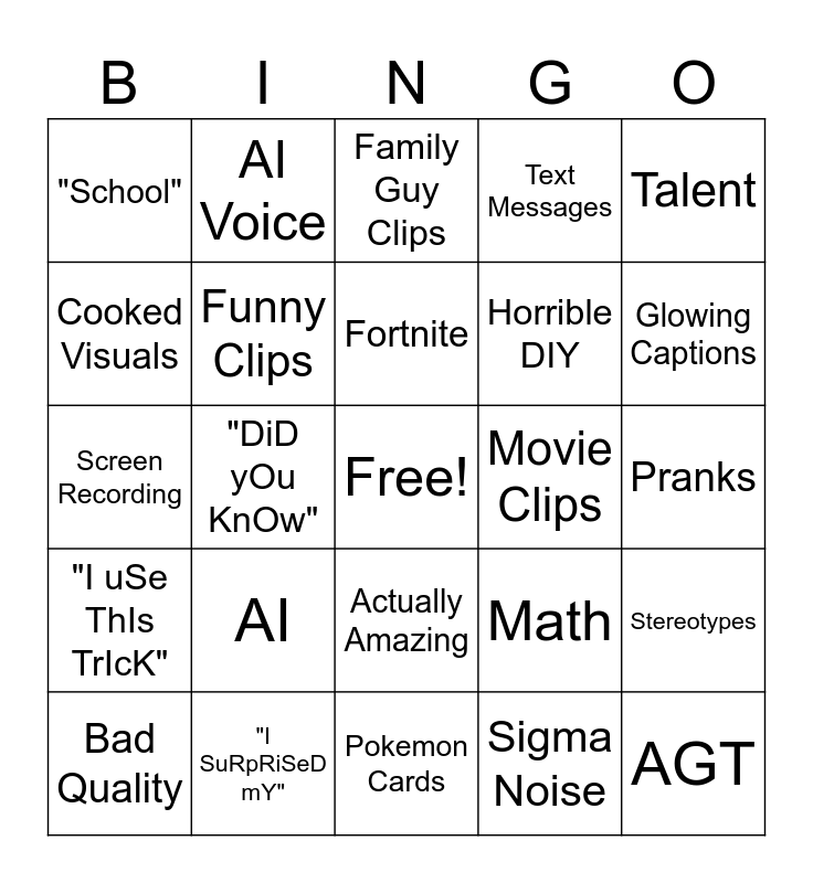 This bingo card has a free space and 28 words: Stereotypes, For Kids Duh, Horrible DIY, Sigma Noise, Cooked Visuals, Family Guy Clips, AI Voice, "I uSe ThIs TrIcK", Movie Clips, Bad Quality, Screen Recording, Text Messages, "I SuRpRiSeD mY", Pokemon Cards, Glowing Captions, ALL MY FELLAS, AI, Funny Clips, Fortnite, Actually Amazing, "School", VS, AGT, "DiD yOu KnOw", Pranks, Math, Talent and Young Sheldon.