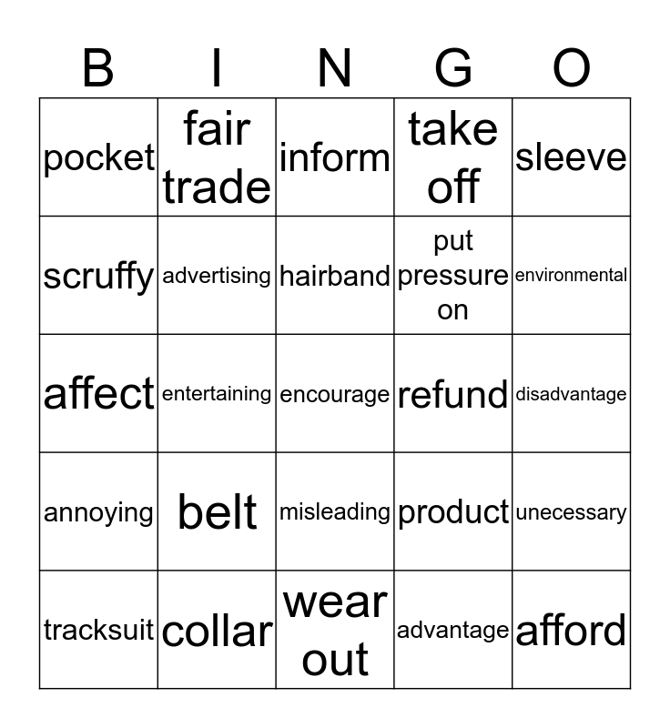 This bingo card has a free space and 24 words: belt, collar, hairband, tracksuit, sleeve, pocket, scruffy, fair trade, refund, misleading, put pressure on, affect, product, unecessary, advertising, advantage, disadvantage, inform, environmental, entertaining, afford, annoying, take off and wear out.