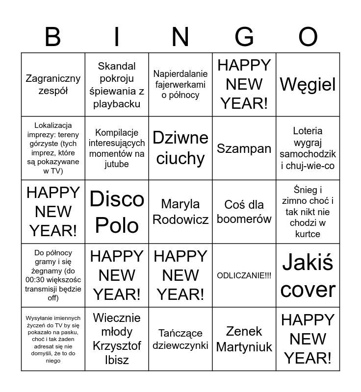 This bingo card has 25 words: Do północy gramy i się żegnamy (do 00:30 większośc transmisji będzie off), Wiecznie młody Krzysztof Ibisz, Maryla Rodowicz, Zenek Martyniuk, Węgiel, Zagraniczny zespół, Skandal pokroju śpiewania z playbacku, Napierdalanie fajerwerkami o północy, Coś dla boomerów, Jakiś cover, Lokalizacja imprezy: tereny górzyste (tych imprez, które są pokazywane w TV), Kompilacje interesujących momentów na jutube, Tańczące dziewczynki, ODLICZANIE!!!, Loteria wygraj samochodzik i chuj-wie-co, Wysyłanie imiennych życzeń do TV by się pokazało na pasku, choć i tak żaden adresat się nie domyśli, że to do niego, Disco Polo, Dziwne ciuchy, Szampan, Śnieg i zimno choć i tak nikt nie chodzi w kurtce, HAPPY NEW YEAR!, HAPPY NEW YEAR!, HAPPY NEW YEAR!, HAPPY NEW YEAR! and HAPPY NEW YEAR!.