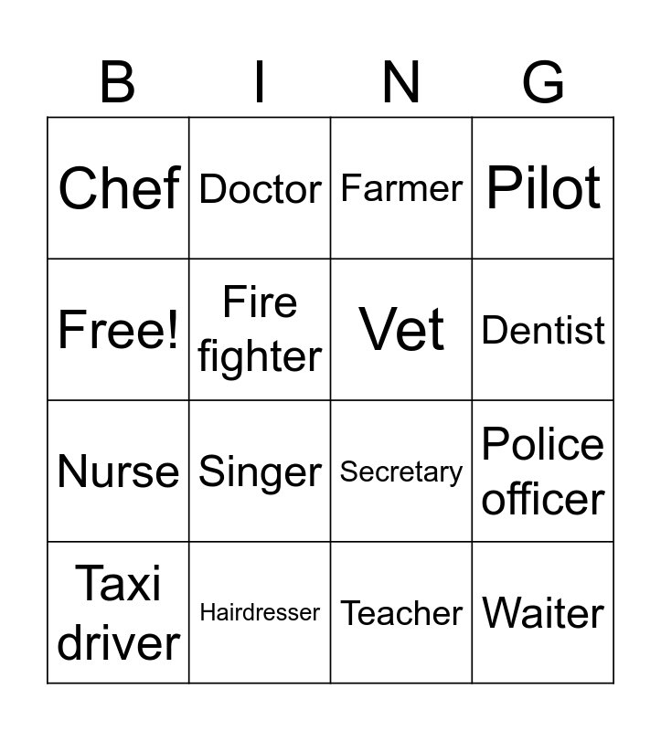 This bingo card has 16 words: Hairdresser, Police officer, Farmer, Chef, Nurse, Doctor, Secretary, Teacher, Free!, Fire fighter, Taxi driver, Pilot, Singer, Dentist, Vet and Waiter.