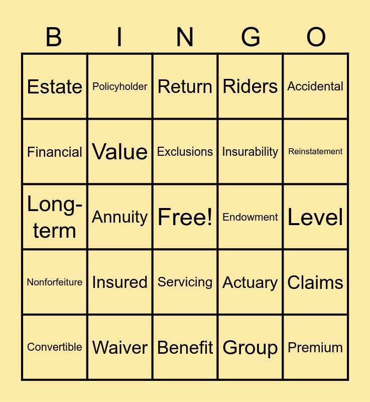 This bingo card has a free space and 49 words: Policy, Premium, Beneficiary, Benefit, Insured, Underwriting, Policyholder, Term, Financial, Universal, Value, Riders, Claims, Actuary, Risk, Medical, Exclusions, Endowment, Surrender, Accidental, Annuity, Group, Estate, Insurability, Lapse, Reinstatement, Convertible, Loan, Servicing, Nonforfeiture, Variable, Living, Guaranteed, Pre-existing, Waiver, Settlement, Contestability, Takaful, Level, Permanent, Mortgage, Substandard, Renewable, Incontestability, Long-term, Return, Disability, Commissions and Agency.