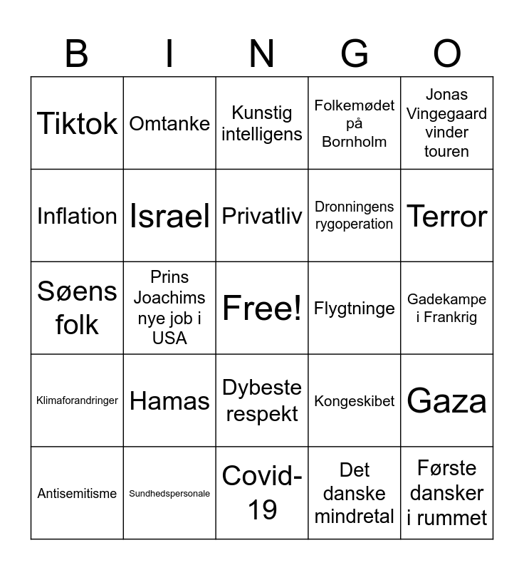 This bingo card has a free space and 38 words: Prins Christians 18 års, Stormflod, Ukraine, Israel, Gaza, Hamas, Privatliv, Statsbesøg fra Spanien, Jonas Vingegaard vinder touren, Dronningens rygoperation, Prins Joachims nye job i USA, Folkemødet på Bornholm, Første dansker i rummet, Gadekampe i Frankrig, Inflation, Klimaforandringer, Krig, Kunstig intelligens, Unges trivsel/mistrivsel, Flygtninge, Tiktok, Sundhedspersonale, Terror, Antisemitisme, Stress, Covid-19, Gud bevare Danmark, Kronprinsparret, Færøerne, Grønland<, Medfølelse, Dybeste respekt, Det danske mindretal, Omtanke, Samfundssind, Kongeskibet, Søens folk and Beredskabsstyrelsen.