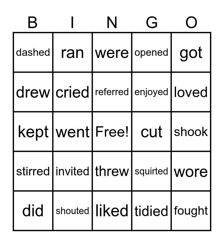 This bingo card has a free space and 82 words: admitted, was, were, annoyed, baked, blew, brought, bought, carried, caught, changed, came, cried, cut, danced, dashed, did, drew, drank, dropped, ate, enjoyed, fought, got, went, had, helped, hit, hugged, hurt, invited, was, kept, knew, learned, liked, lived, looked, loved, made, mashed, opened, planned, played, put, ran, read, referred, said, saw, set, shook, shouted, sang, sat, skipped, slept, spoke, splashed, squirted, stayed, stepped, stirred, stopped, studied, swept, swam, took, tasted, taught, tore, thought, threw, tidied, tipped, tried, understood, visited, woke, wanted, wore and wrote.