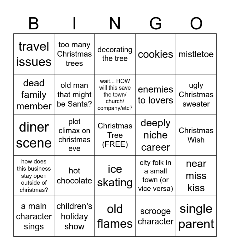 This bingo card has a free space and 48 words: widow(er), single parent, old person love side plot, old flames, hot chocolate, baking scene, too many Christmas trees, actually recognizable actor, dead family member, wise child, old man that might be Santa?, cookies, near miss kiss, city folk in a small town (or vice versa), trapped by snow storm, town square scene, wait... HOW will this save the town/ church/ company/etc?, deeply niche career, love interests wearing red and green, mistletoe, plot climax on christmas eve, scrooge character, travel issues, enemies to lovers, financial troubles, ugly Christmas sweater, a main character sings, caroling, ice skating, how does this business stay open outside of christmas?, wrapping presents, love interest already in a relationship, recent breakup, fireplace, children's holiday show, taking selfies!, it's snowing!, Christmas Wish, ornament making, handmade gift, gingerbread house contest, buying a Christmas tree, decorating the tree, sledding, diner scene, hanging stockings, charity event or fund-raiser and Christmas-themed name (place or person).