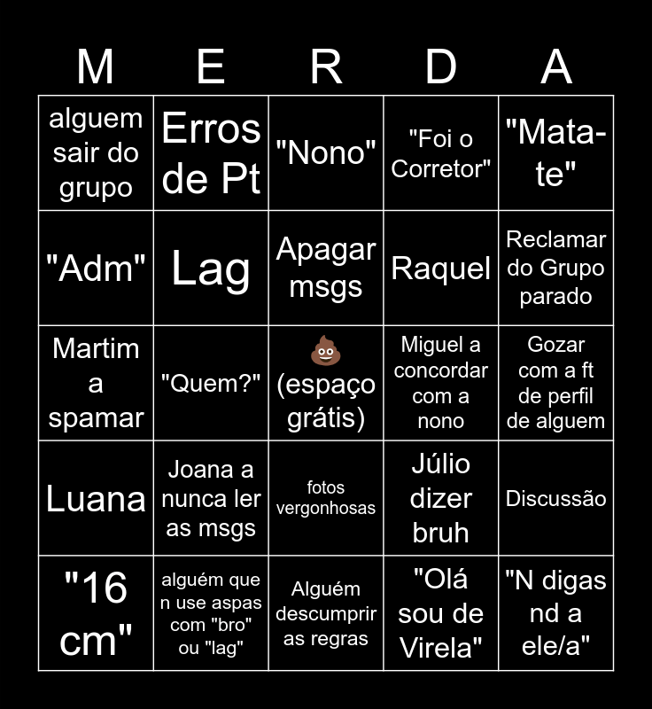 This bingo card has a free space and 28 words: Discussão, adicionar uma pessoa random, Raquel, "Olá sou de Virela", "Adm", "Nono", Erros de Pt, Luana, Miguel a concordar com a nono, "16 cm", Martim a spamar, "Foi o Corretor", alguém que n use aspas com "bro" ou "lag", Alguém descumprir as regras, Reclamar do Grupo parado, mensagem a meio das aulas, Joana a nunca ler as msgs, Lag, Apagar msgs, fotos vergonhosas, alguem sair do grupo, Miguel a ficar fdd por alguma coisa, "N digas nd a ele/a", "Quem?", Gozar com a ft de perfil de alguem, Júlio dizer bruh, "Mata-te" and Agressividade.