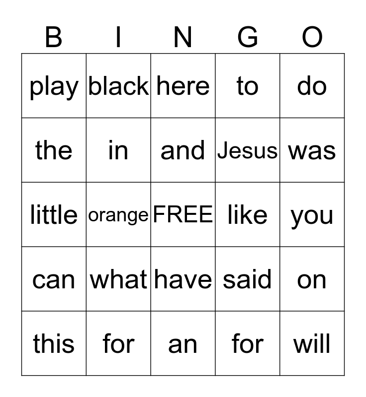 This bingo card has a free space and 24 words: what, for, and, this, do, play, the, black, like, have, Jesus, little, said, on, in, for, you, here, was, orange, will, can, to and an.