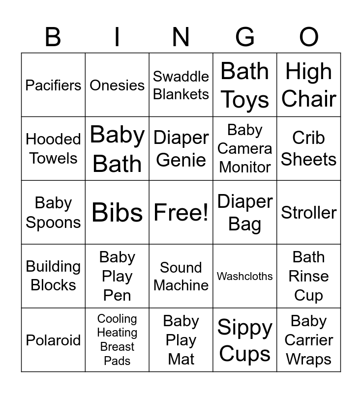 This bingo card has a free space and 50 words: Nova Baby Swing, Baby Carrier Wraps, Baby Activity Jumper, Baby Play Mat, Baby Play Pen, 6-in-1 Baby Carrier, Onesies, Baby Bath Robe], Hooded Towels, Baby Pajamas, Baby Bath, Bath Toys, Bath Rinse Cup, Washcloths, Trunk Organizer, Diaper Changing Pad, Diaper Genie, Diaper Bag, Baby Bottles, High Chair, Bibs, Sippy Cups, Pacifiers, Baby Camera Monitor, Baby Grooming Kit, Baby Wash or Shampoo, Crib Sheets, Crib Mattress, Swaddle Blankets, Sound Machine, Crib, Bedside Bassinet, Nursing Pillow, Lactation Massager, Cooling Heating Breast Pads, Car Seat, Car Seat Cover, Cloth Baby Books, Stroller Fan, Stroller, Clifford Books, Teether, High Chair Toy, Nursing Bra, Polaroid, Baby Spoons, Baby Kitchen Stepper, Alphabet Flash Cards, Building Blocks and Montessori Climbing Gym.