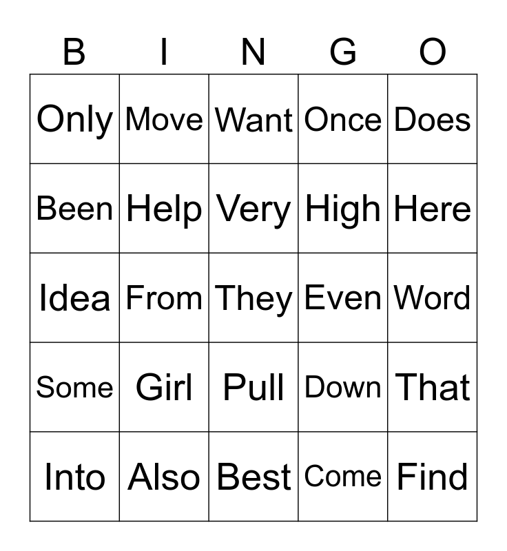 This bingo card has 30 words: Into, Any, Very, Work, Does, Only, Move, Pull, Even, Find, Some, Help, Open, Come, That, Give, From, They, Down, Here, Idea, Also, Want, High, Word, Been, Girl, Best, Once and Done.