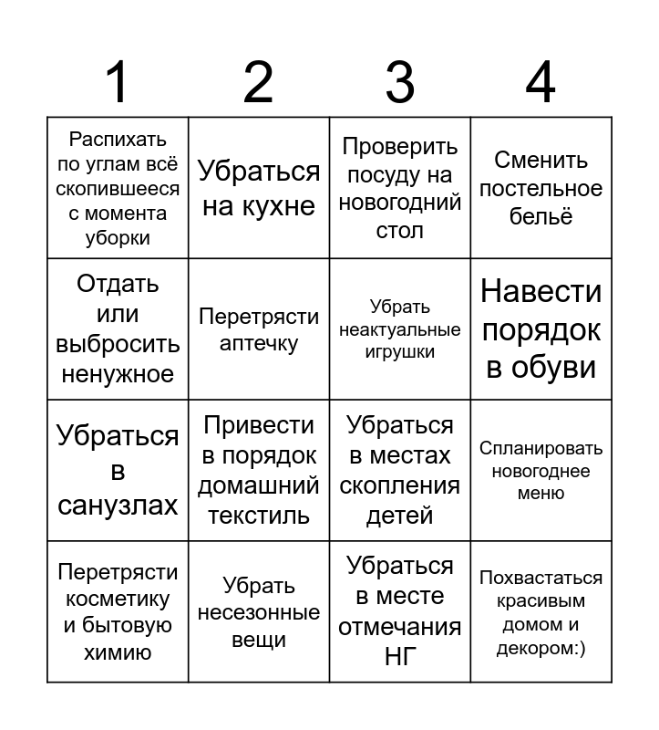 This bingo card has 16 words: Убрать несезонные вещи, Спланировать новогоднее меню, Проверить посуду на новогодний стол, Распихать по углам всё скопившееся с момента уборки, Убраться в санузлах, Убраться на кухне, Убраться в местах скопления детей, Убраться в месте отмечания НГ, Отдать или выбросить ненужное, Перетрясти аптечку, Перетрясти косметику и бытовую химию, Сменить постельное бельё, Привести в порядок домашний текстиль, Навести порядок в обуви, Убрать неактуальные игрушки and Похвастаться красивым домом и декором:).