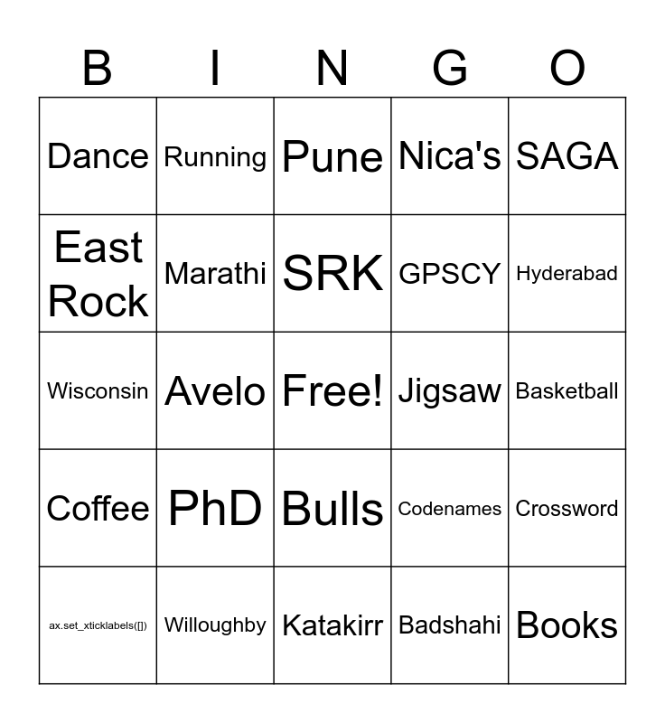 This bingo card has a free space and 29 words: ax.set_xticklabels([]), ax.set_yticklabels([]), Avelo, Yale, Dance, Pune, Marathi, PhD, Jigsaw, Willoughby, Basketball, Books, Katakirr, Badshahi, Hyderabad, Nashua, Bulls, Coffee, SAGA, Wisconsin, Codenames, Yale Rep, GPSCY, East Rock, Nica's, Running, Crossword, SRK and FaceTime.