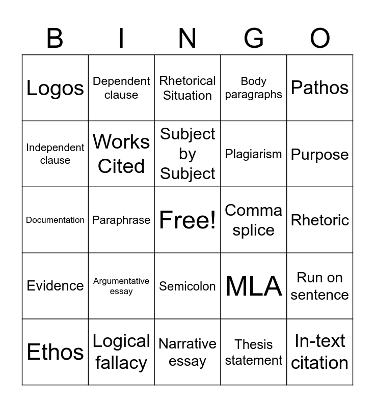 This bingo card has a free space and 25 words: Argumentative essay, Narrative essay, Subject by Subject, Ethos, Pathos, Logos, Independent clause, Dependent clause, Comma splice, Semicolon, Plagiarism, Documentation, MLA, Run on sentence, Works Cited, Friendly Audience, Rhetoric, Rhetorical Situation, Purpose, Paraphrase, In-text citation, Logical fallacy, Evidence, Body paragraphs and Thesis statement.