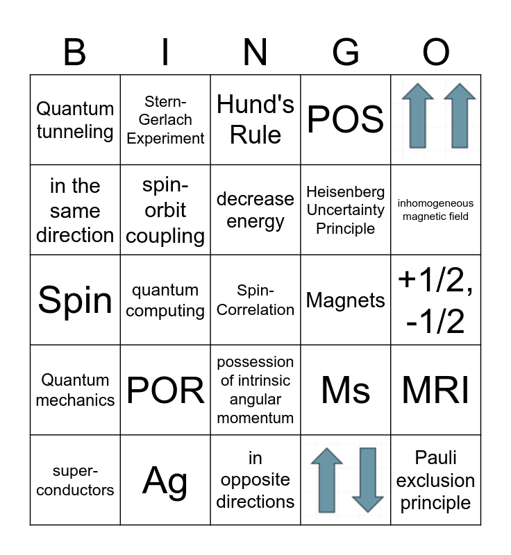 This bingo card has 2 images, a free space and 22 words: POR, Ag, decrease energy, super-conductors, Quantum tunneling, in the same direction, Stern-Gerlach Experiment, Magnets, possession of intrinsic angular momentum, Heisenberg Uncertainty Principle, Spin, Ms, MRI, spin-orbit coupling, +1/2, -1/2, Hund's Rule, inhomogeneous magnetic field, quantum computing, Pauli exclusion principle, Quantum mechanics, POS and in opposite directions.