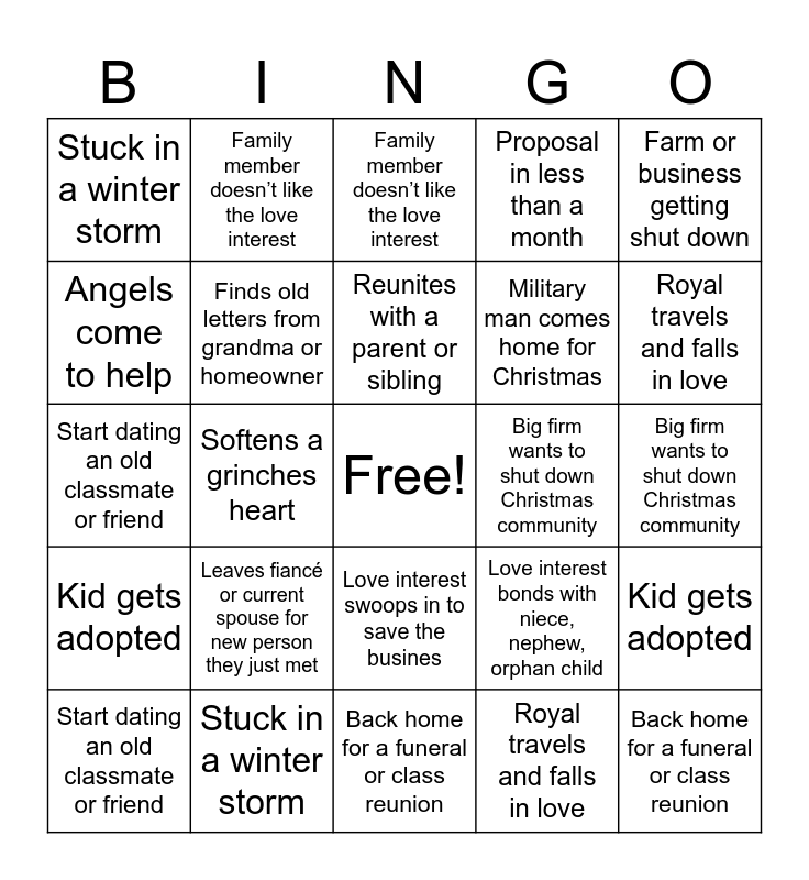 This bingo card has a free space and 45 words: From or Goes back to a small town, Back home for a funeral or class reunion, Recently divorced or widowed, Start dating an old classmate or friend, Meets a Royal someone, Royal travels and falls in love, Family member doesn’t like the love interest, Owns a Christmas shop like bakery, Farm or business getting shut down, Stuck in a winter storm, Proposal in less than a month, Big firm wants to shut down Christmas community, Love interest swoops in to save the busines, Leaves fiancé or current spouse for new person they just met, From or Goes back to a small town, Back home for a funeral or class reunion, Recently divorced or widowed, Start dating an old classmate or friend, Meets a Royal someone, Royal travels and falls in love, Family member doesn’t like the love interest, Owns a Christmas shop like bakery, Farm or business getting shut down, Stuck in a winter storm, Proposal in less than a month, Big firm wants to shut down Christmas community, Love interest swoops in to save the business, Leaves fiancé or current spouse for new person they just met, Love interest bonds with niece, nephew, orphan child, Kid gets adopted, Love interest bonds with niece, nephew, orphan child, Kid gets adopted, Asks for hot chocolate or cocoa, Kisses under a mistletoe, Sings a Christmas carol as a duet, Softens a grinches heart, Chops a Christmas tree or goes to tree farm, Christmas competition, Ice skating or other snow/outdoor Christmas activities, Reunites with a parent or sibling, Angels come to help, Military man comes home for Christmas, Christmas pregnancy or baby, Finds old letters from grandma or homeowner and CEO tries to talk the business owner into selling the family business.