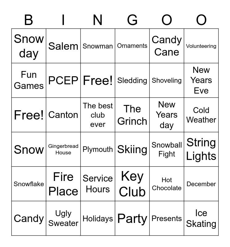 This bingo card has 36 words: Key Club, Service Hours, Party, Fun Games, Snow, The Grinch, PCEP, Holidays, Candy Cane, Hot Chocolate, New Years Eve, Ornaments, December, Canton, Sledding, Snow day, Snowflake, New Years day, Free!, Snowman, The best club ever, Gingerbread House, Skiing, Plymouth, Snowball Fight, Salem, Shoveling, Ugly Sweater, Free!, Volunteering, Ice Skating, Candy, String Lights, Cold Weather, Fire Place and Presents.