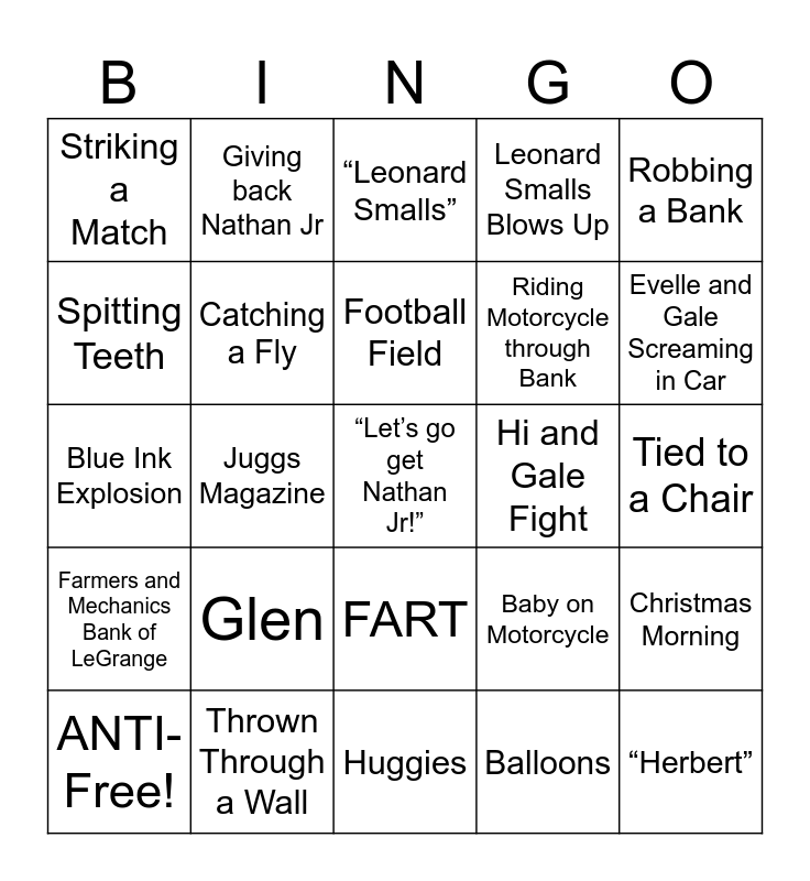 This bingo card has 29 words: ANTI-Free!, Hi writes a letter to Ed, Juggs Magazine, “Herbert”, Striking a Match, “Leonard Smalls”, Catching a Fly, Glen, Hi and Gale Fight, Thrown Through a Wall, Tied to a Chair, “Let’s go get Nathan Jr!”, Huggies, Balloons, Evelle and Gale Screaming in Car, “Fools Paradise”, FART, Farmers and Mechanics Bank of LeGrange, Robbing a Bank, Blue Ink Explosion, Baby on Motorcycle, Car Explosion, Riding Motorcycle through Bank, Spitting Teeth, Leonard Smalls Blows Up, Giving back Nathan Jr, Christmas Morning, Football Field and Ed and Hi are Old.