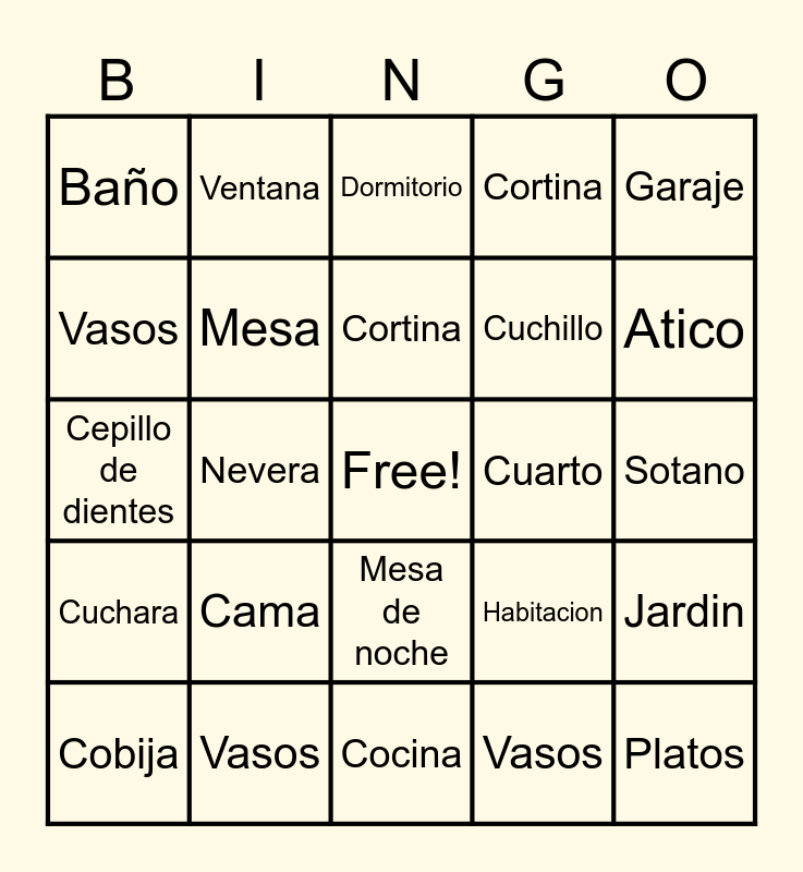 This bingo card has a free space and 31 words: Cocina, Silla, Nevera, El comedor, Baño, Dormitorio, Mesa, Habitacion, Cuarto, Vasos, Sotano, Platos, Estufa, Puerta, Atico, Nevera, Jardin, Cama, Cuchara, Mesa de noche, Garaje, Sala, Cobija, Ventana, Cuchillo, Vasos, Cortina, Cepillo de dientes, Vasos, Cortina and Cepillo de dientes.