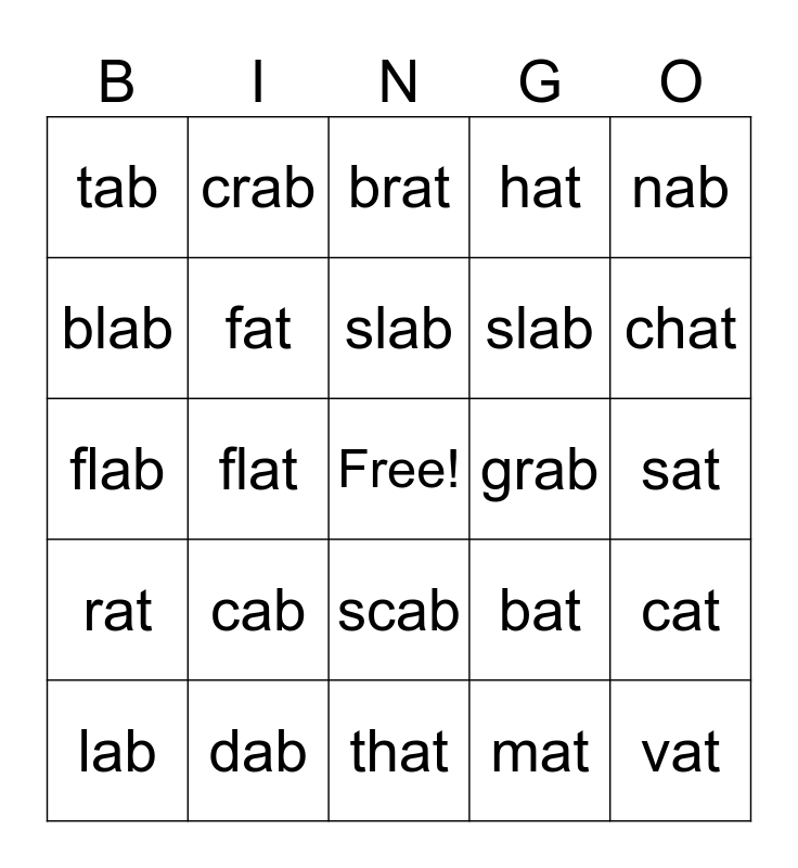 This bingo card has a free space and 24 words: cab, dab, slab, lab, nab, tab, blab, crab, grab, scab, slab, flab, bat, cat, fat, mat, sat, brat, chat, flat, vat, rat, hat and that.