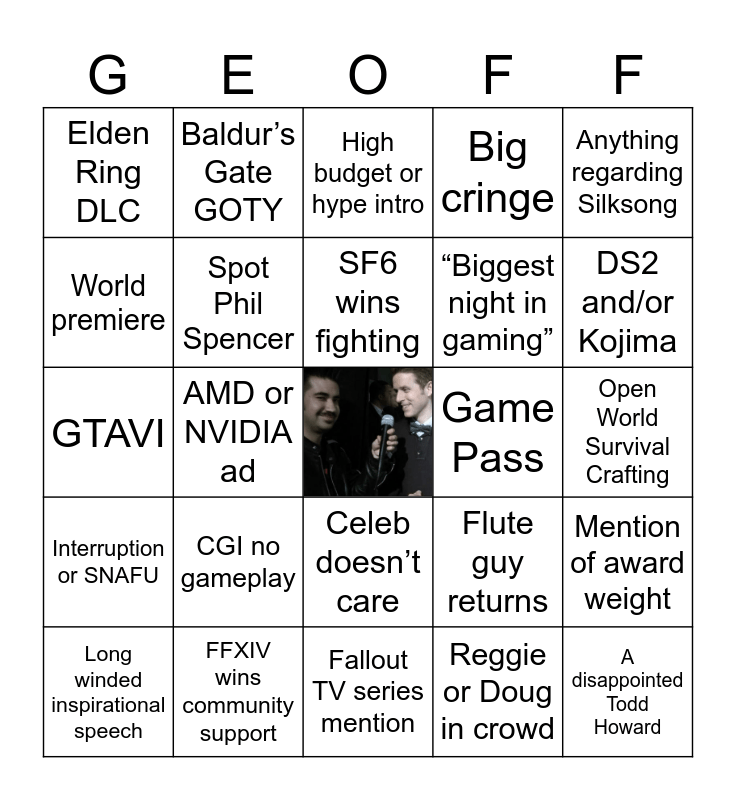 This bingo card has a free space and 24 words: CGI no gameplay, FFXIV wins community support, SF6 wins fighting, Long winded inspirational speech, Anything regarding Silksong, Elden Ring DLC, World premiere, Baldur’s Gate GOTY, Game Pass, Celeb doesn’t care, “Biggest night in gaming”, GTAVI, Flute guy returns, Mention of award weight, Spot Phil Spencer, Reggie or Doug in crowd, Open World Survival Crafting, High budget or hype intro, DS2 and/or Kojima, AMD or NVIDIA ad, A disappointed Todd Howard, Interruption or SNAFU, Big cringe and Fallout TV series mention.