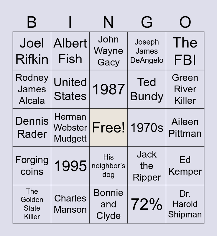 This bingo card has a free space and 35 words: California, Robert Pickton, Lois Gibson, United States, His neighbor’s dog, Joseph James DeAngelo, Rodney James Alcala, A Dentist, 1987, Gianni Versace, Dennis Rader, The FBI, 1%, Alcatraz Federal Penitentiary, Joel Rifkin, 1970s, 72%, Herman Webster Mudgett, Forging coins, Dr. Harold Shipman, Jack the Ripper, The Golden State Killer, Ed Kemper, Charles Manson, John Wayne Gacy, Green River Killer, Murder Castle, William Heirens, Ted Bundy, Aileen Pittman, Richard Ramirez, Bonnie and Clyde, 1995, Albert Fish and Los Angeles.