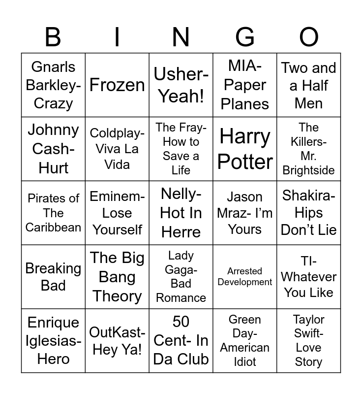This bingo card has 30 words: OutKast- Hey Ya!, Beyonce- Crazy in Love, Eminem- Lose Yourself, Rihanna- Umbrella, Gnarls Barkley- Crazy, Usher- Yeah!, Coldplay- Viva La Vida, Lady Gaga- Bad Romance, Jason Mraz- I’m Yours, 50 Cent- In Da Club, Shakira- Hips Don’t Lie, Nelly- Hot In Herre, Green Day- American Idiot, Taylor Swift- Love Story, The Killers- Mr. Brightside, The Office, Arrested Development, Breaking Bad, The Big Bang Theory, Two and a Half Men, Pirates of The Caribbean, Gladiator, Frozen, Harry Potter, Johnny Cash- Hurt, MIA- Paper Planes, TI- Whatever You Like, Enrique Iglesias- Hero, The Fray- How to Save a Life and N Sync- Bye Bye Bye.