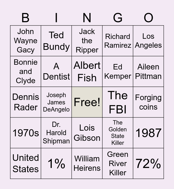 This bingo card has a free space and 35 words: His neighbor’s dog, Murder Castle, Robert Pickton, A Dentist, Lois Gibson, Richard Ramirez, Bonnie and Clyde, Rodney James Alcala, Albert Fish, Gianni Versace, Dennis Rader, Los Angeles, 1995, Alcatraz Federal Penitentiary, John Wayne Gacy, The FBI, Green River Killer, Joseph James DeAngelo, 1970s, 72%, The Golden State Killer, United States, 1987, 1%, Jack the Ripper, Aileen Pittman, California, Charles Manson, Ed Kemper, Forging coins, Herman Webster Mudgett, William Heirens, Dr. Harold Shipman, Ted Bundy and Joel Rifkin.