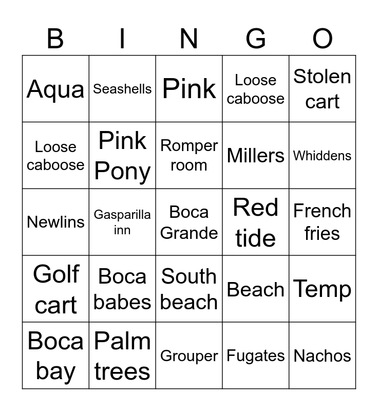 This bingo card has a free space and 24 words: Boca babes, Palm trees, Romper room, Boca bay, Stolen cart, Aqua, Loose caboose, Seashells, Red tide, South beach, Millers, Newlins, Beach, Temp, Pink Pony, Fugates, French fries, Pink, Whiddens, Gasparilla inn, Nachos, Golf cart, Loose caboose and Grouper.