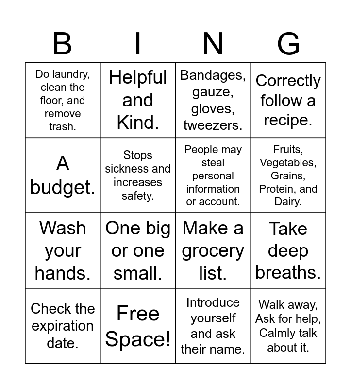 This bingo card has 16 words: Free Space!, Take deep breaths., Bandages, gauze, gloves, tweezers., Do laundry, clean the floor, and remove trash., Wash your hands., Helpful and Kind., Make a grocery list., Introduce yourself and ask their name., A budget., Stops sickness and increases safety., Check the expiration date., Correctly follow a recipe., One big or one small., Fruits, Vegetables, Grains, Protein, and Dairy., People may steal personal information or account. and Walk away, Ask for help, Calmly talk about it..