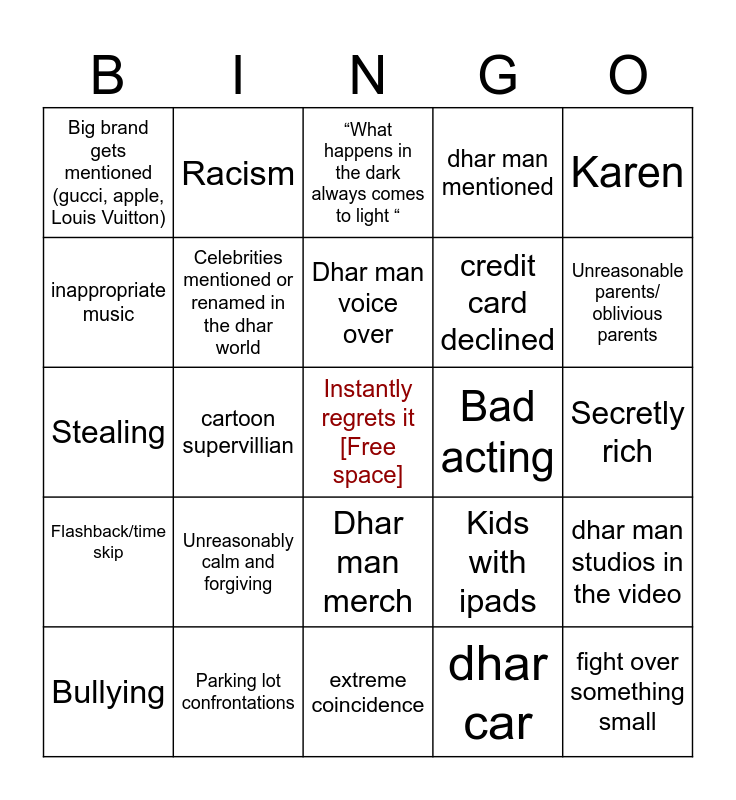 This bingo card has a free space and 34 words: PS5, dhar car, “You see”/“so you see”, Bald cap/bad wig, Flashback/time skip, Celebrities mentioned or renamed in the dhar world, Karen, Bullying, Racism, Sexism, Dhar man voice over, “What happens in the dark always comes to light “, Fraud, “Hey dhar man fam”, Bad acting, Unreasonable parents/ oblivious parents, Parking lot confrontations, Stealing, Unreasonably calm and forgiving, Kids with ipads, Dhar man merch, Poor/homeless Or evicted, Big brand gets mentioned (gucci, apple, Louis Vuitton), Secretly rich, extreme coincidence, fight over something small, dhar man mentioned, clearly in the wrong person has attitude, credit card declined, inappropriate music, problematic lesson, cartoon supervillian, dhar man studios in the video and bad green screen.