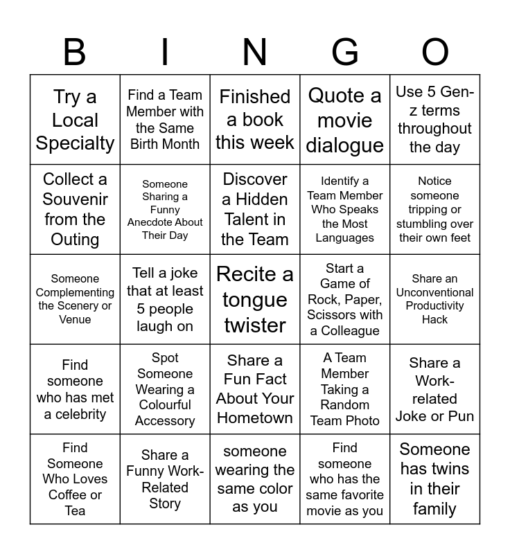 This bingo card has a free space and 24 words: Spot Someone Wearing a Colourful Accessory, Share a Funny Work-Related Story, Discover a Hidden Talent in the Team, Find Someone Who Loves Coffee or Tea, Use 5 Gen-z terms throughout the day, Try a Local Specialty, Collect a Souvenir from the Outing, Find a Team Member with the Same Birth Month, Start a Game of Rock, Paper, Scissors with a Colleague, Share a Fun Fact About Your Hometown, Identify a Team Member Who Speaks the Most Languages, Someone Complementing the Scenery or Venue, A Team Member Taking a Random Team Photo, Share a Work-related Joke or Pun, Someone Sharing a Funny Anecdote About Their Day, Find someone who has the same favorite movie as you, Share an Unconventional Productivity Hack, Finished a book this week, Notice someone tripping or stumbling over their own feet, Tell a joke that at least 5 people laugh on, Someone has twins in their family, Find someone who has met a celebrity, Quote a movie dialogue and someone wearing the same color as you.