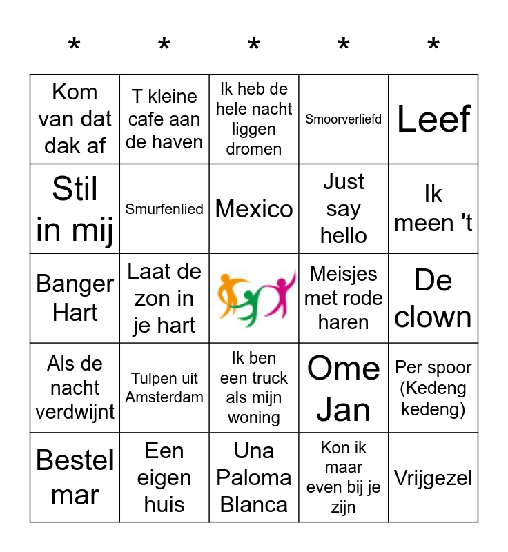 This bingo card has a free space and 50 words: Zijn het je ogen, Vrijgezel, Vlieg met me mee, Una Paloma Blanca, Tulpen uit Amsterdam, T was aan de Costa del Sol, T kleine cafe aan de haven, T is weer voorbij die mooie zomer, Stil in mij, Stiekum gedanst, Smurfenlied, Smoorverliefd, Per spoor (Kedeng kedeng), Ome Jan, Oerend Hart, Mooi was die tijd, Mexico, Meisjes met rode haren, Malle Babbe, Leef, Laat de zon in je hart, Kon ik maar even bij je zijn, Kom van dat dak af, Just say hello, Jan Klaassen de trompetter, Ik verscheurde je foto, Ik meen 't, Ik krijg een heel apart gevoel van binnen, Ik heb de hele nacht liggen dromen, Ik ben een truck als mijn woning, Het is een nacht, Heb je even voor mij, Even aan mijn moeder vragen, Er staat een paard in de gang, Een eigen huis, Een beetje verliefd, Dromen zijn bedrog, De vlieger, De glimlach van een kind, De clown, Dans je de hele nacht met mij, Dag Zuster Ursula, Brabant, Bossie Rode Rozen, Bestel mar, Banger Hart, Als sterren aan de hemel staan, Als het avond is, Als de nacht verdwijnt and Als de morgen is gekomen.