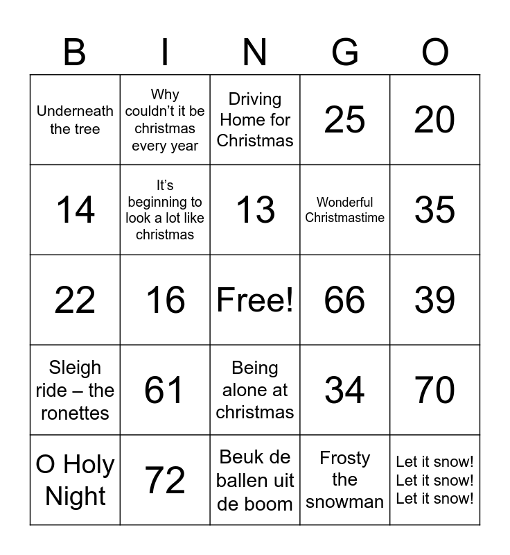 This bingo card has a free space and 75 words: Feliz Navidad, 2, Driving Home for Christmas, 4, Rocking’ Around the Christmas Tree, Do They Know It’s Christmas?, 7, 8, All I Want for christmas is you, 10, Thank God It’s Christmas, Niets is cooler dan kerstmis, 13, 14, Last Christmas, 16, It’s the most wonderful time of the year, Let it snow! Let it snow! Let it snow!, 19, 20, Jingle Bell Rock, 22, It’s beginning to look a lot like christmas, Why couldn’t it be christmas every year, 25, 26, Have yourself a merry litthe christmas, Rockin’ around the christmas tree, 29, 30, Here comes santa claus, Mistletoe – Justin Bieber, 33, 34, 35, Wonderful Christmastime, Rudolph the red nosed reindeer, 38, 39, Frosty the snowman, Mary’s Boy Child / Oh My Lord, 42, 43, Baby, it’s cold outside, Santa Claus is comin’ to town, 46, O Holy Night, Underneath the tree, 49, 50, Christmas time, Being alone at christmas, 53, 54, Santa tell me, 56, Merry christmas eeryone, 58, Lonely this christmas, Shake up christmas, 61, 62, Stop the cavalry, Snowman – Sia, 65, 66, 67, White christmas, My only wish (this year), 70, Sleigh ride – the ronettes, 72, All alone on christmas, Beuk de ballen uit de boom and Als de eerste sneeuw valt.