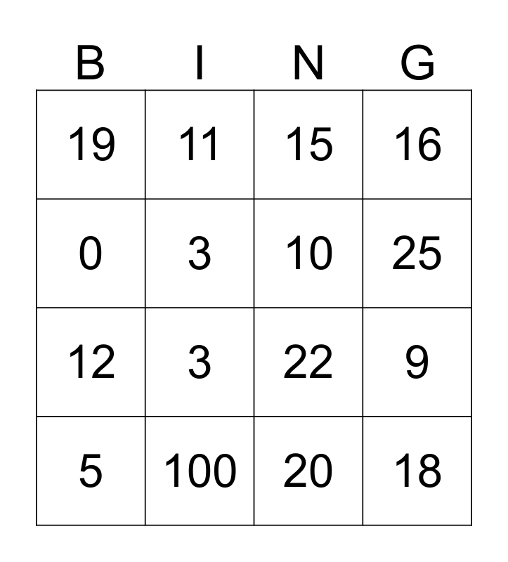 This bingo card has 16 words: 100, 9, 15, 19, 12, 11, 22, 20, 0, 3, 5, 16, 3, 25, 10 and 18.